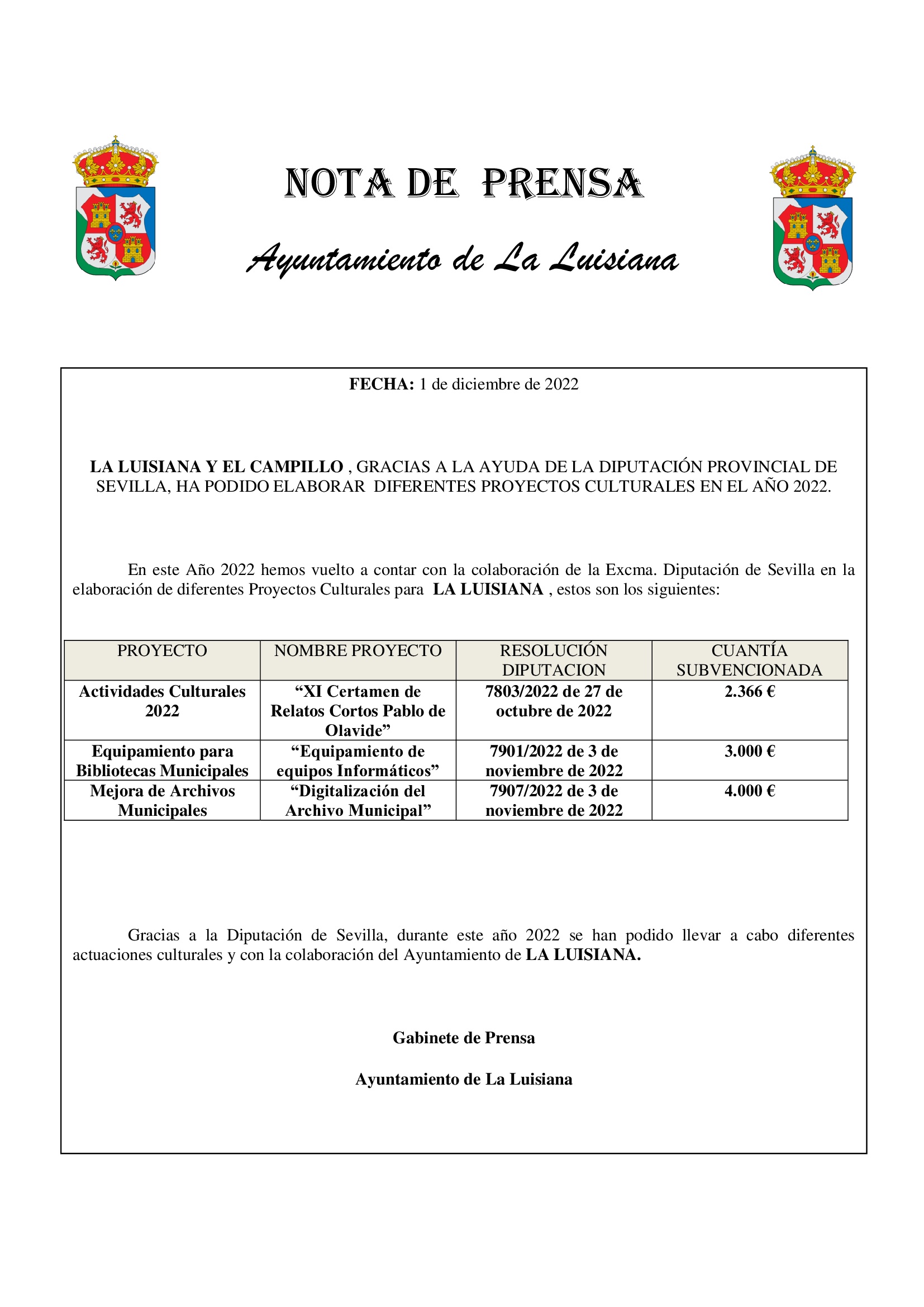 La Diputación de Sevilla, destina fondos de cultura en 2022 para diferentes actividades y equipamiento en colaboración con el Ayuntamiento de La Luisiana