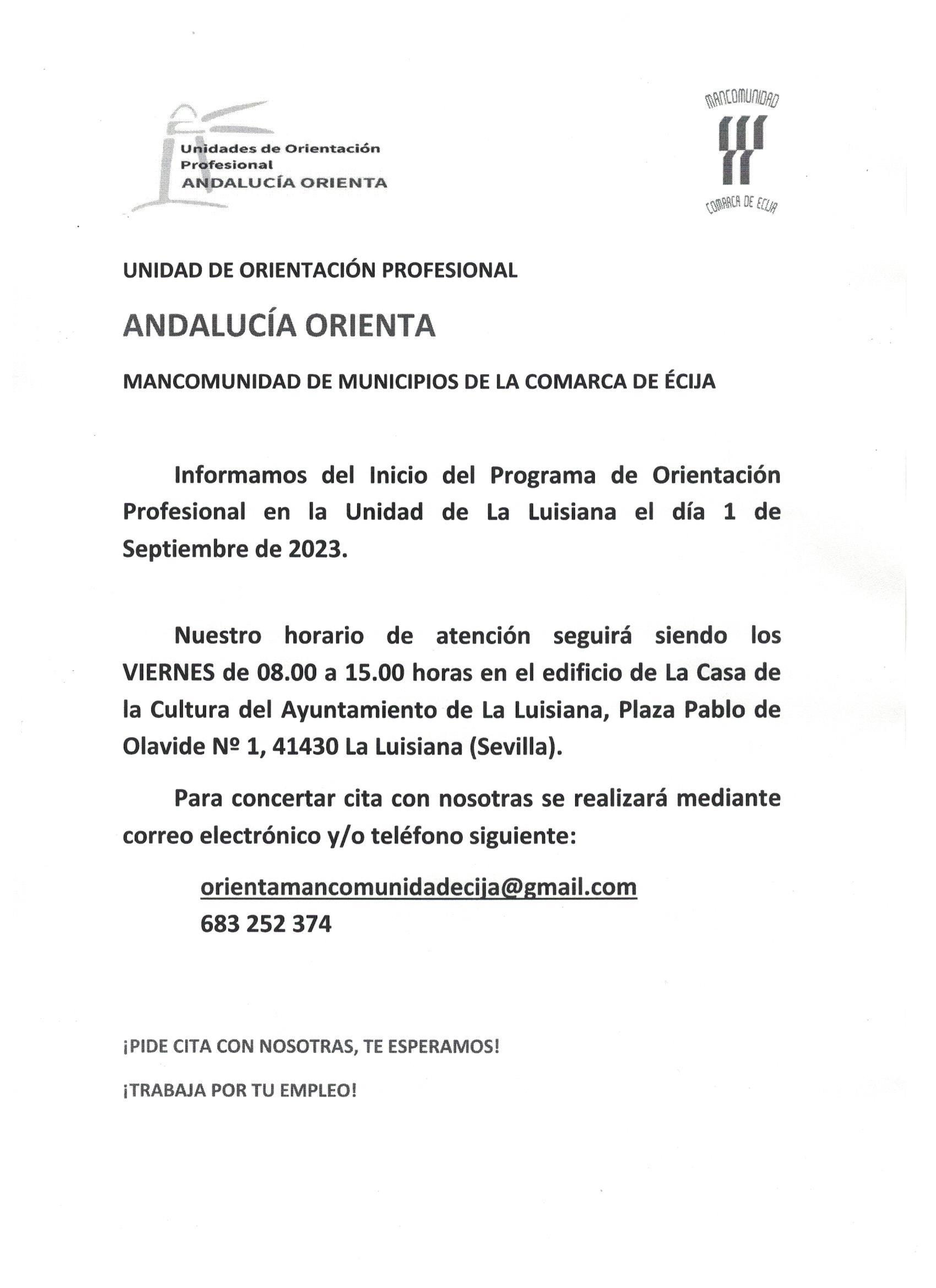 La Unidad de Orientación de la Mancomunidad de Municipios de la Comarca de Écija, está compuesto por un equipo de Técnicos en Orientación Laboral (genéricos, especialista en género y autorientador) y administrativos.